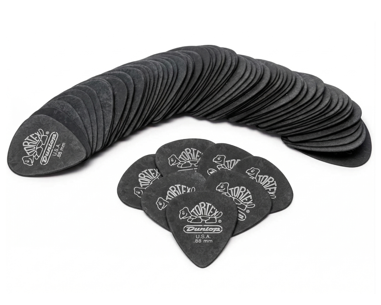 Kit com 72 palhetas Dunlop Tortex Standard 0,88 mm na cor preta, com formato tradicional e superfície que proporciona firmeza na pegada e precisão nos movimentos.