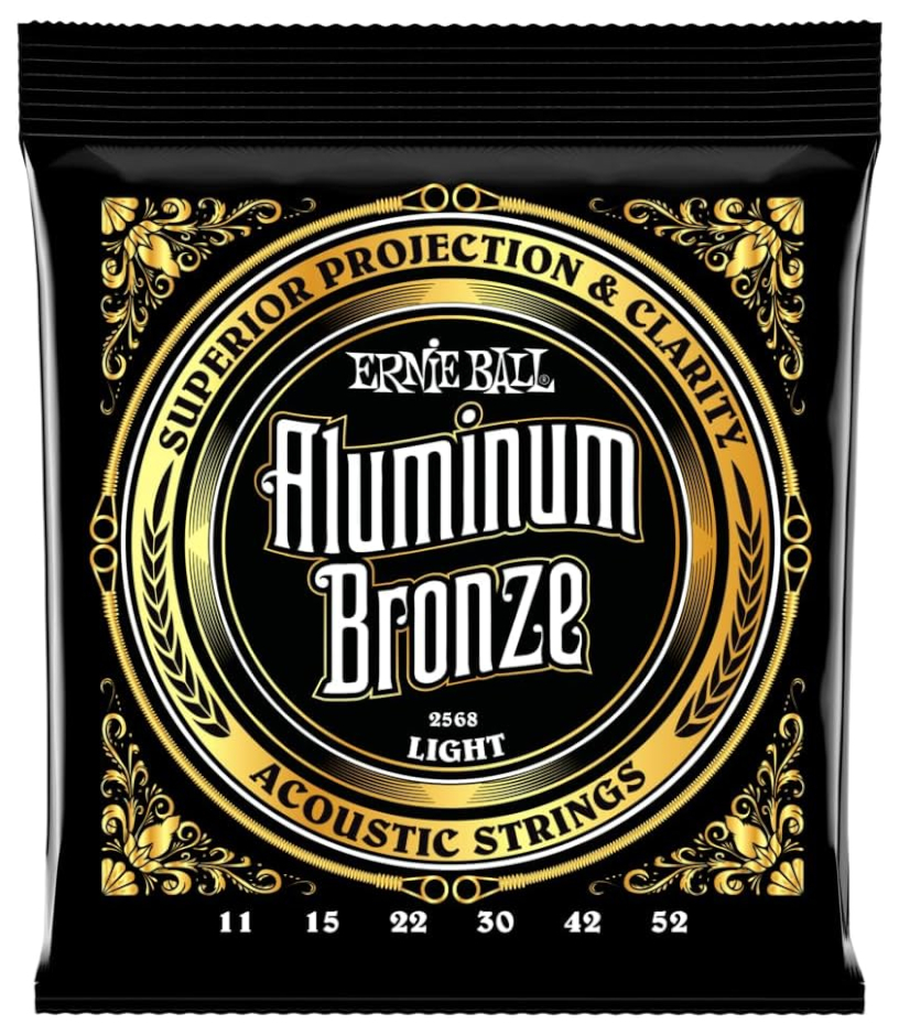 Cordas Aluminum Bronze são feitas com fios hexagonais de aço Maraging Ernie Ball no núcleo, envoltos em fios de alumínio bronze que fornecem baixos mais pronunciados juntamente com agudos brilhantes e nítidos.
