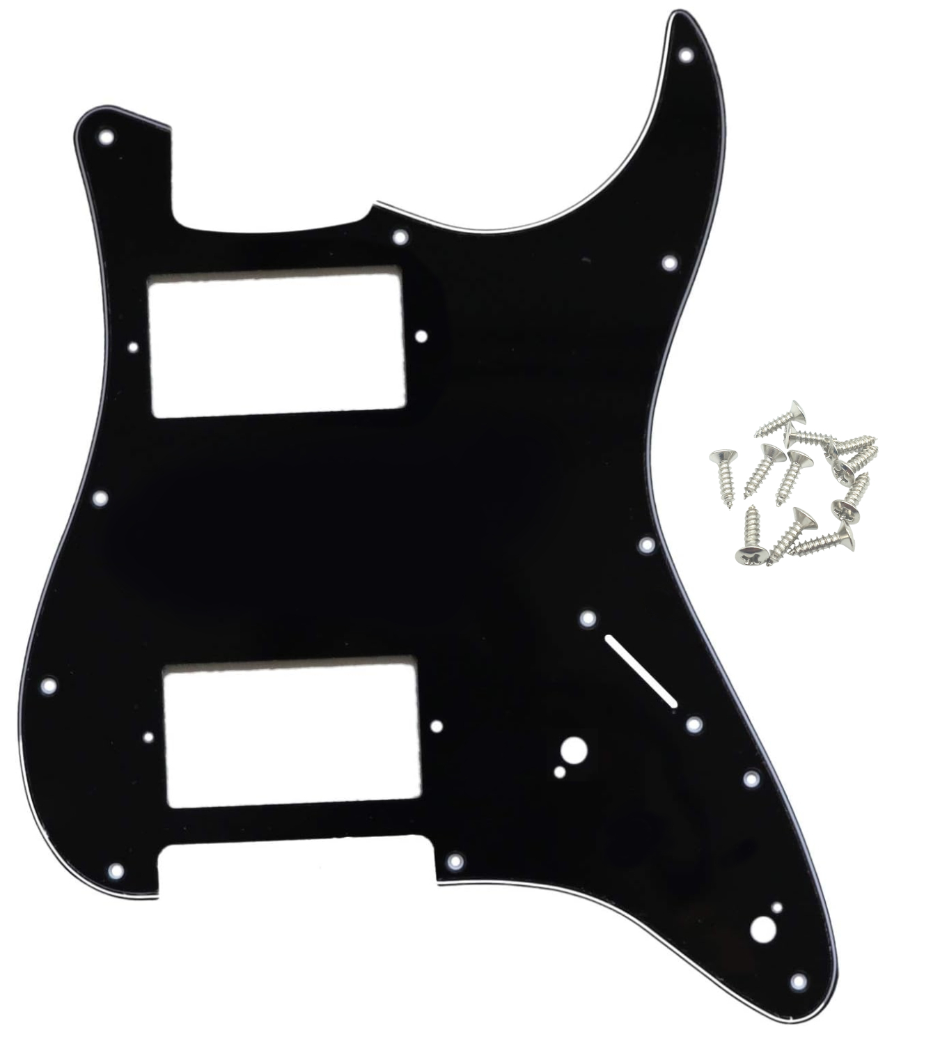 Possui 11 furos para fixação, garantindo boa compatibilidade com diversos modelos de guitarras estilo Strat adaptadas para configuração HH. Acompanha parafusos que facilitam a instalação, tornando a substituição do escudo antiga rápida e prática.