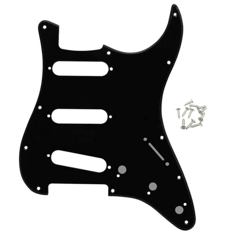 O escudo conta com configuração SSS (três captadores single coil) e 11 furos para fixação, garantindo compatibilidade com a maioria das guitarras padrão Strat. Acompanha parafusos para facilitar a instalação.