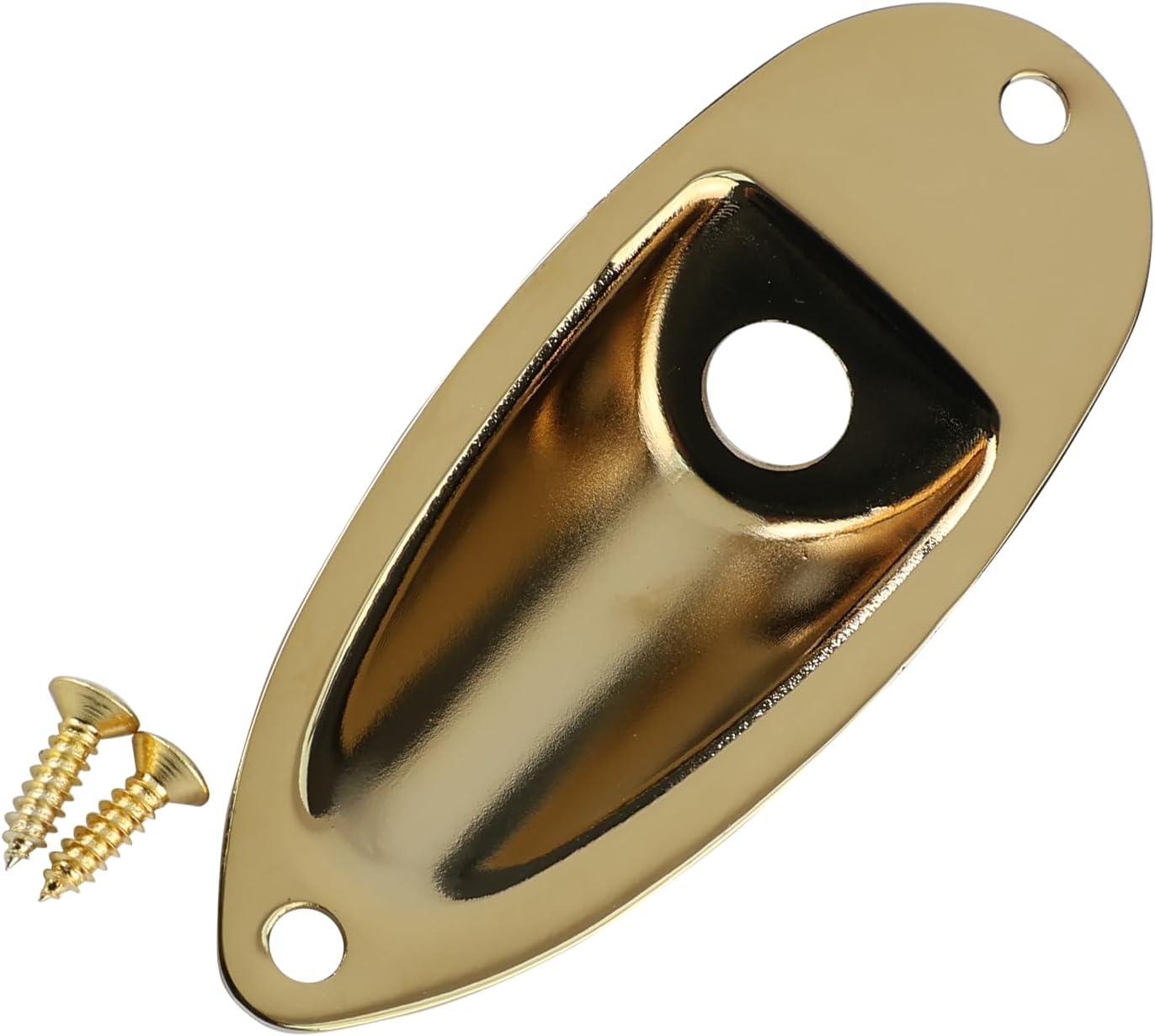 Jack Plate tipo canoa Dolphin para guitarra Stratocaster, com acabamento dourado, desenvolvido para fixação e proteção da entrada de jack do instrumento.