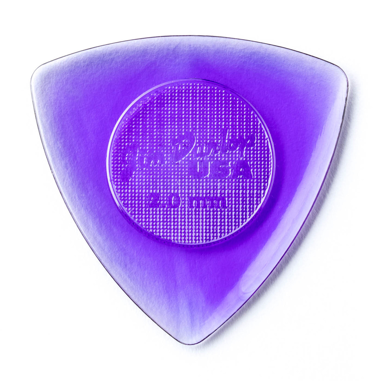 Palheta Dunlop Tri Stubby 2,0 mm modelo 473R na cor roxa, com formato triangular que oferece três pontas utilizáveis e maior versatilidade no uso.