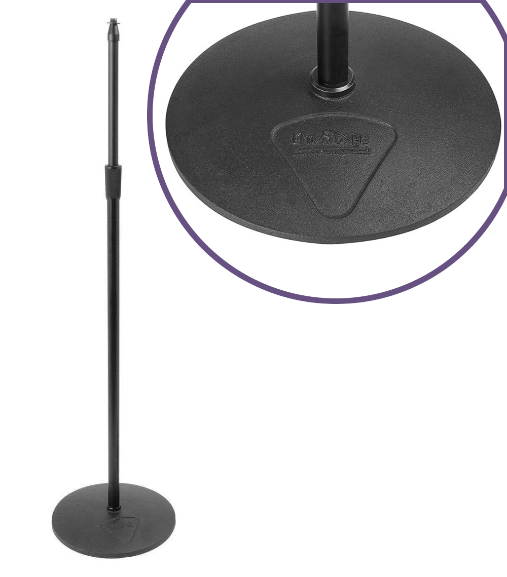 Pedestal para microfone com base redonda pesada de 25cm e portátil, que oferece estabilidade excepcional e resiste a condições exigentes.