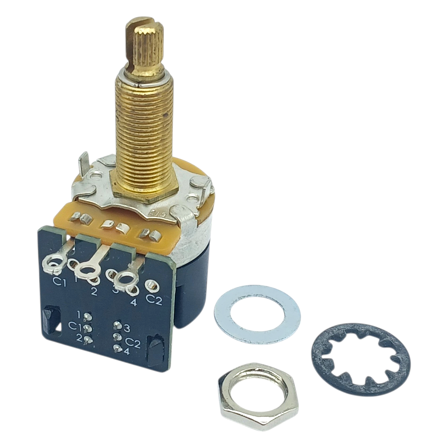 Fabricado com eixo metálico de alta qualidade e matéria-prima selecionada, o modelo A500-PPL oferece excelente durabilidade e precisão no controle de volume ou tonalidade. Seu sistema push-pull agrega uma função extra ao circuito, permitindo alternar recursos como split de captadores, inversão de fase ou outras modificações elétricas com praticidade.